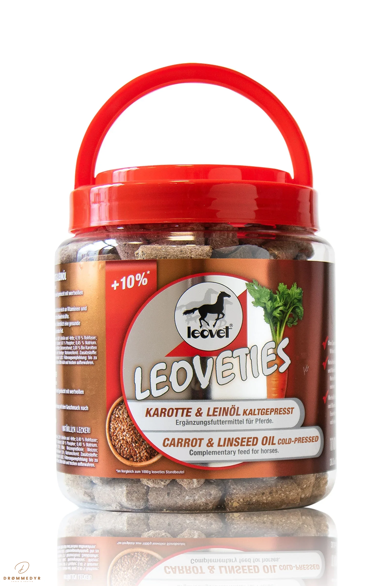 Leoveties Gulerod & Hørfrøolie er lækre, naturlige hestegodbidder lavet med sprøde gulerødder og nærende hørfrøolie – en smagfuld kombination, der både forkæler og tilfører sundhed. Den høje kvalitet af råvarer giver en aromatisk og velsmagende snack, som de fleste heste elsker.