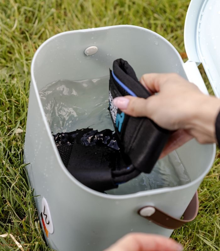 Læg kølebooten i en spand vand, indtil materialet er helt gennemvædet. Vrid den derefter let og placér den omkring hestens ben. Takket være de specielle materialer fordamper vandet langsomt og trækker varme ud af benet, hvilket giver en behagelig og kølende effekt.