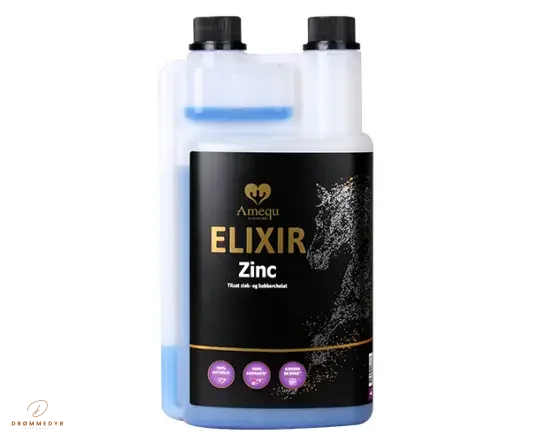 Amequ Elixir Zink er et flydende tilskud, der sikrer hesten et letoptageligt tilskud af zink – et vigtigt mineral for hud, pels, hove og immunforsvar. Zink spiller en central rolle i kroppens helingsprocesser, i fældningsperioder og for at opretholde en sund hud- og pelskvalitet.