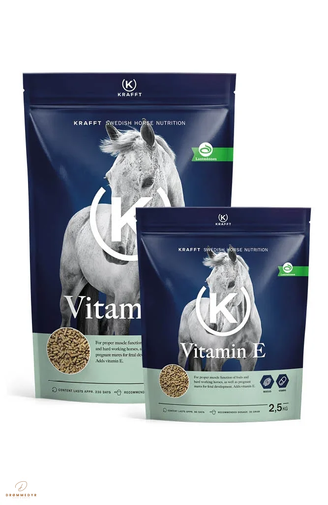Krafft Vitamin E er et effektivt tilskud, der understøtter muskelfunktion, restitution og immunforsvar. Vitamin E er en kraftig antioxidant, som beskytter cellerne mod oxidativt stress, og i kombination med selen giver det en målrettet støtte til hestens præstation og velvære.
