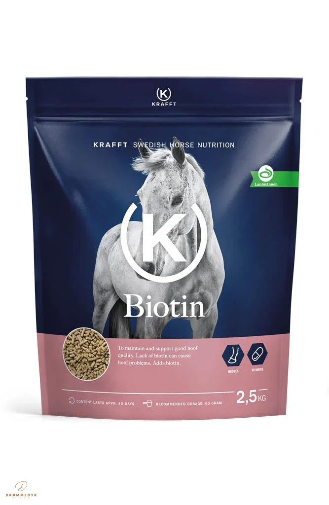 Med Krafft Biotin 2,5 kg får din hest et effektivt og målrettet tilskud, der styrker hovene og fremmer en sund udstråling.