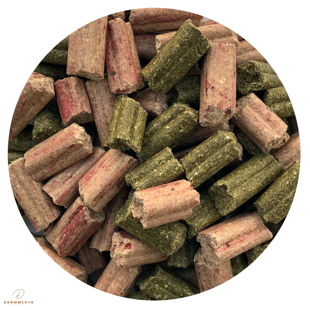 Hvedefodermel, hvede, lucerne, majs, puffede majs, hvedeklid, hørfrøkager, solsikkefrø, havreflager, havreskaller, majsgluten, calciumcarbonat, rødbede, hørfrø, natriumklorid.