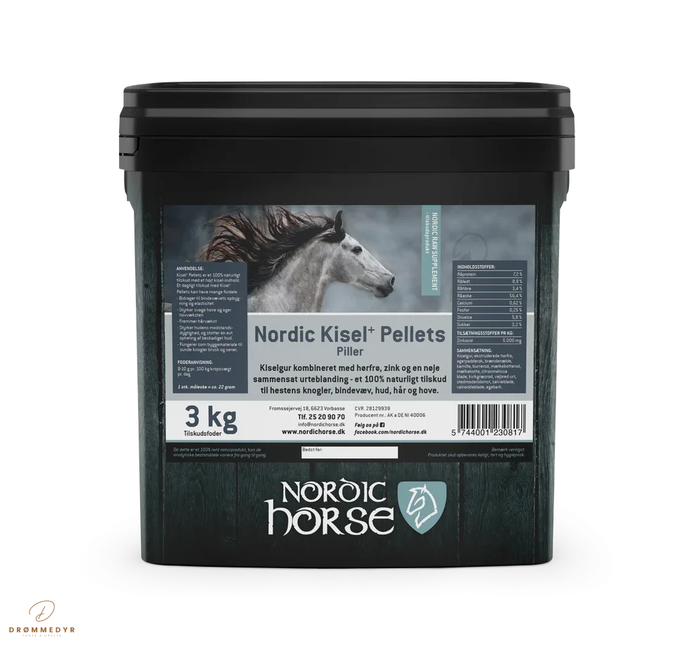 Kiselgur kombineret med hørfrø, zink og en nøje sammensat urteblanding - et 100% naturligt tilskud til hestens knogler, bindevæv, hud, hår og hove.