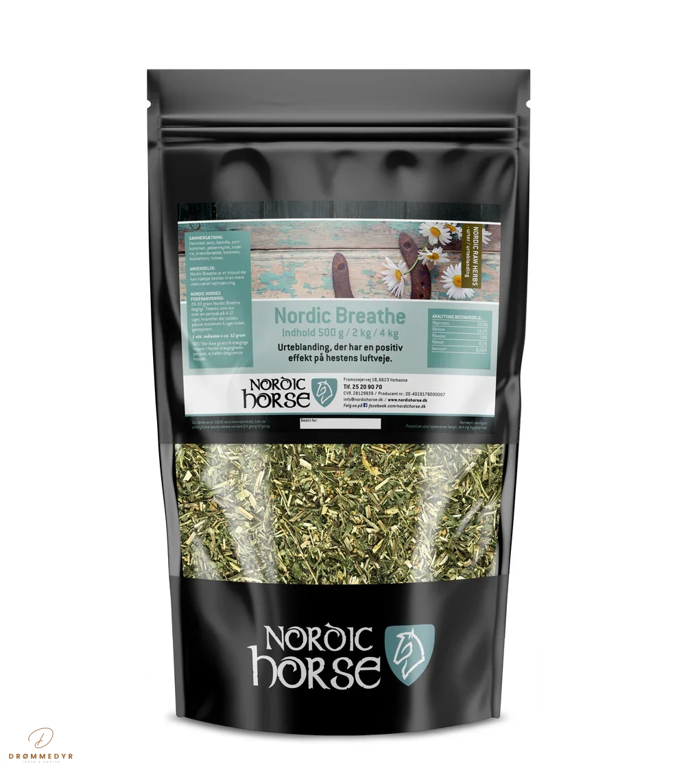 Nordic Breathe er en effektiv kur til hestens luftveje. En blanding af særligt udvalgte urter, der er kendt for deres gavnlige egenskaber i forbindelse med luftvejssystemet. Fremmer et sundt immunforsvar og kan medvirke til at rense lungerne og lindre irriterede slimhinder.