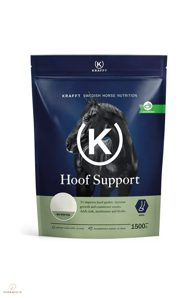 Krafft Hoof Support er et specialudviklet tilskud, der fremmer hovvækst og styrker hovkvaliteten hos heste. Det indeholder biotin, zink, kobber og aminosyrer, som er vigtige byggesten til dannelsen af sunde og stærke hove.