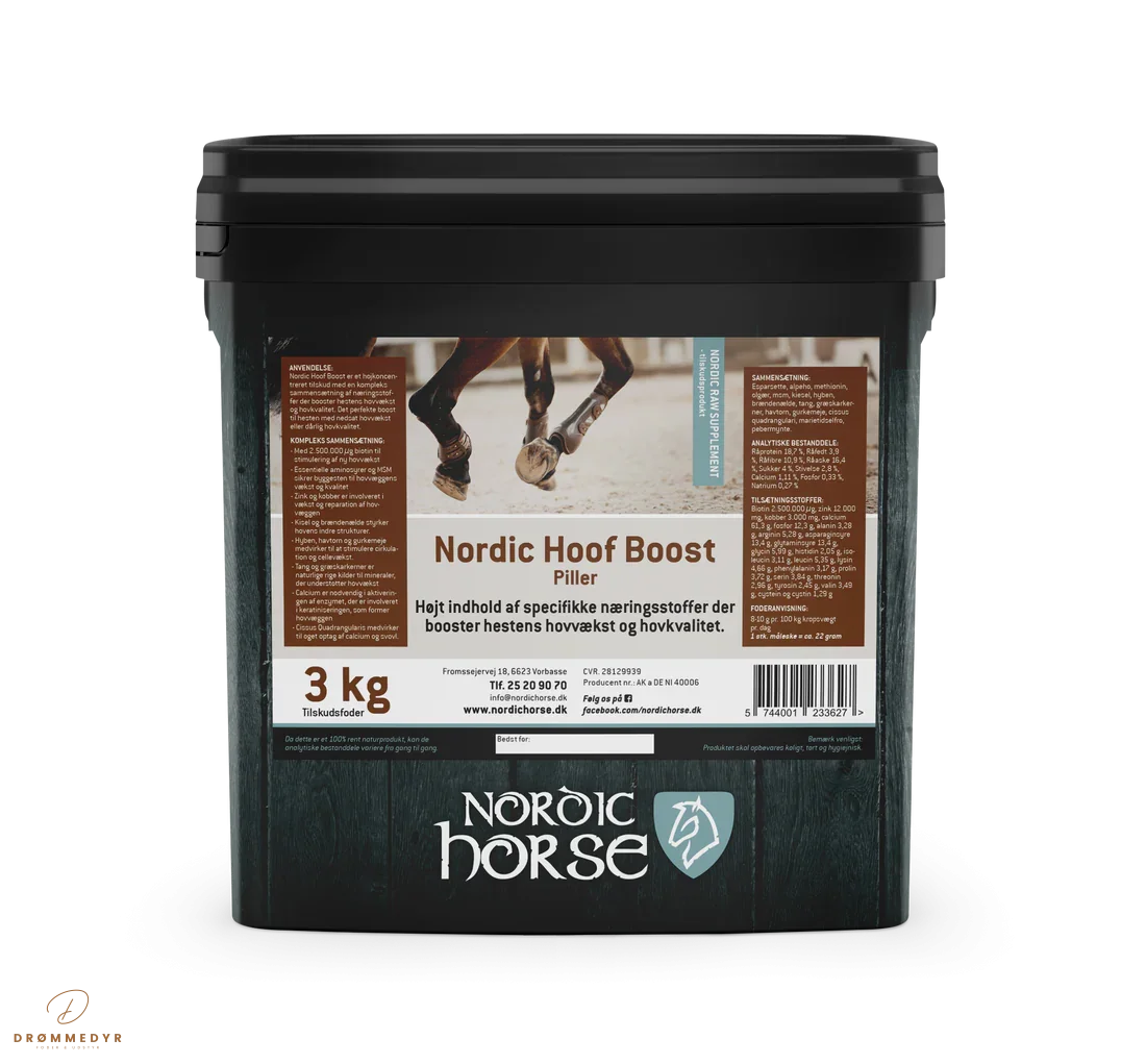 Nordic Hoof Boost er et højkoncentreret tilskud med en kompleks sammensætning af næringsstoffer der booster hestens hovvækst og hovkvalitet. Det perfekte boost til hesten med nedsat hovvækst eller dårlig hovkvalitet.