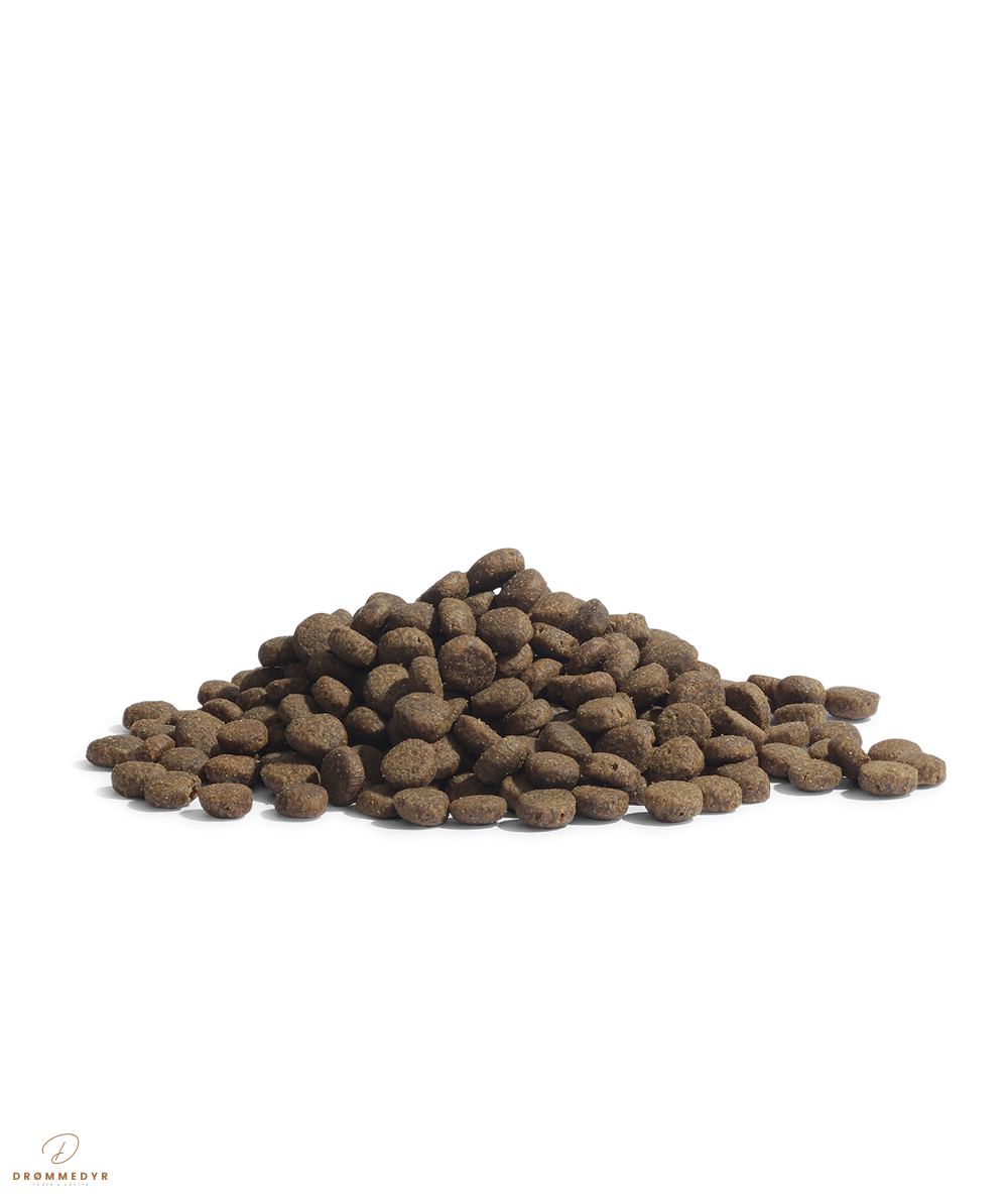 Kylling, and, laks, ærter, kartoffel, gulerod, æble, tranebær, urter, mineraler