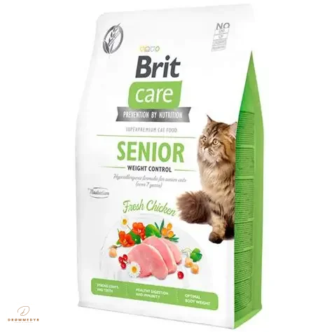 Brit Care Senior Weight Control er et kornfrit fuldfoder skræddersyet til ældre katte (+7 år) samt katte med tendens til overvægt. Foderet har et lavere kalorieindhold og et højt proteinindhold, som hjælper med at bevare muskelmassen, samtidig med at katten holder en sund og stabil vægt.