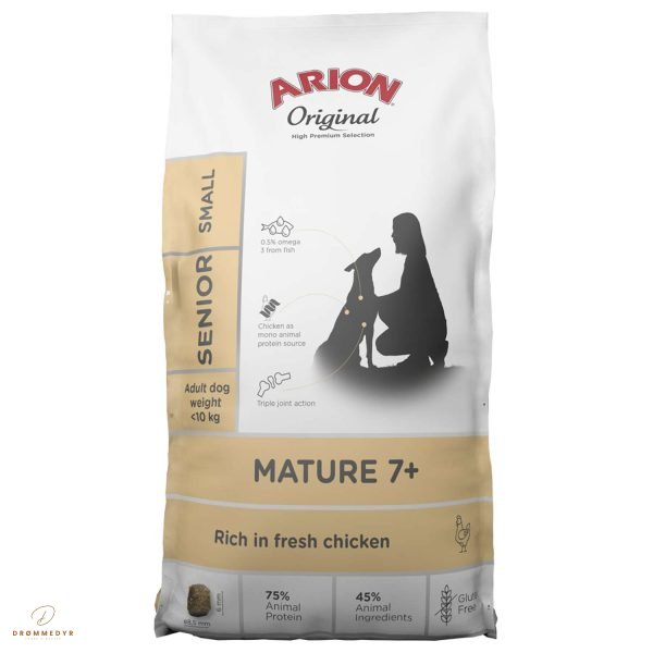 Arion Original Mature Small er et fuldfoder til ældre hunde af små racer (2–10 kg). Når hunden bliver ældre, falder energibehovet, og foderet er derfor sammensat med reduceret kalorieindhold og ekstra næringsstoffer, som støtter led, muskler og immunforsvar. Opskriften med kylling og ris er letfordøjelig, mens små foderpiller er tilpasset små kæber og tænder. Omega-fedtsyrer bidrager til en flot pels og sund hud, så seniorhunden trives i hverdagen.