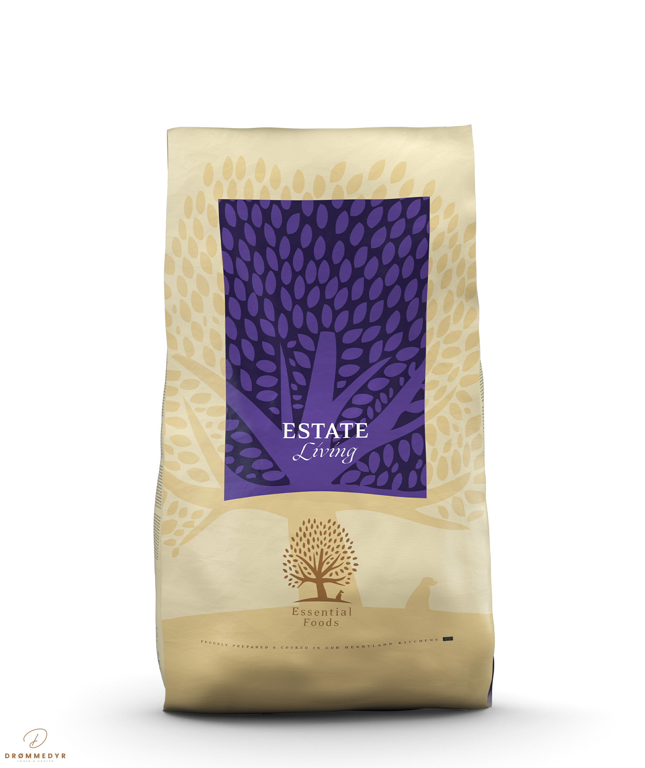ESSENTIAL Estate Living er et kornfrit fuldfoder til voksne hunde, lavet med inspiration fra de britiske godser, hvor kvalitet og ro går hånd i hånd. Opskriften kombinerer frisk og tørret and, kalkun, kylling og fisk – en velsmagende og næringsrig sammensætning, der sikrer din hund et sundt og afbalanceret måltid.