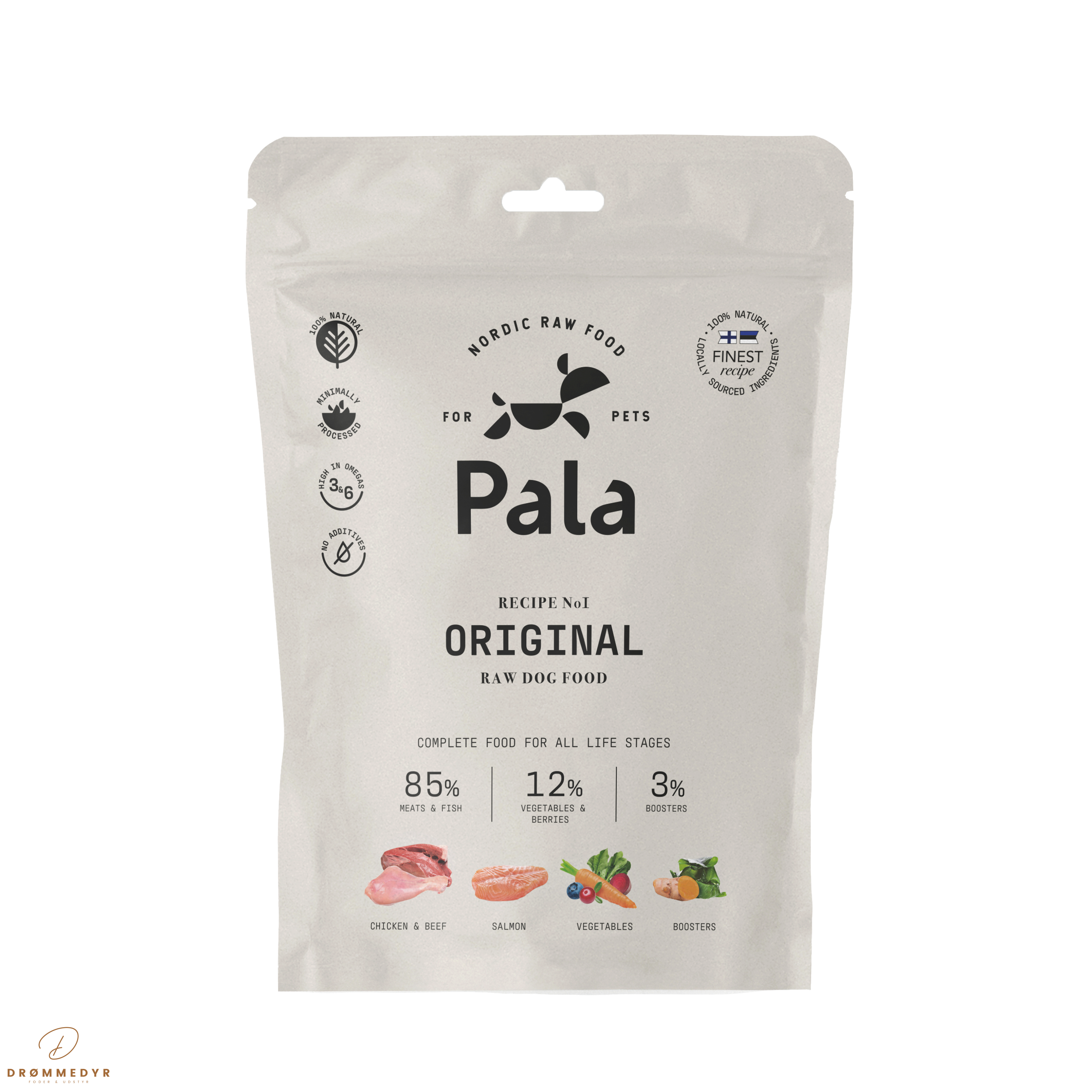 Pala Recipe No. 1 er et lufttørret BARF-foder af høj kvalitet, fremstillet af nøje udvalgte råvarer og tørret skånsomt for at bevare næringsstoffer og smag. Opskriften er Pala’s originale blend og består af flere animalske proteinkilder kombineret med grøntsager, bær og naturlige olier.