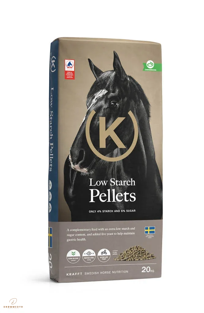 Krafft Low Starch Pellets er et fuldfoder med lavt indhold af stivelse og sukker, udviklet til heste med særlige behov. Foderet er rigt på fibre og kvalitetsprotein, som giver en stabil energi uden store udsving i blodsukkeret.
