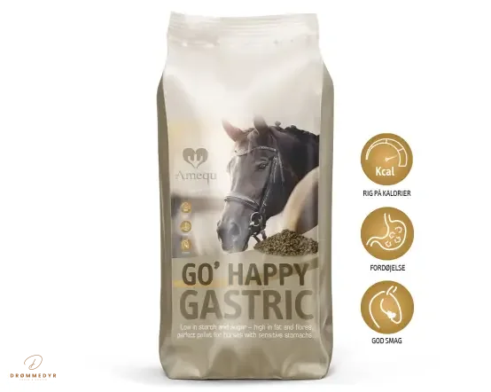 Amequ Go Happy Gastric er et korn- og melassefrit fuldfoder, udviklet til heste med sart fordøjelse. Foderet har et lavt indhold af stivelse og sukker og er baseret på fibre, olie og urter, som giver en skånsom og stabil energiforsyning.