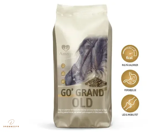 Amequ Go Grand Old er et korn- og melassefrit fuldfoder, specielt udviklet til seniorheste. Foderet har et lavt indhold af sukker og stivelse og er baseret på fibre, olie og kvalitetsprotein, som giver en skånsom og stabil energiforsyning.