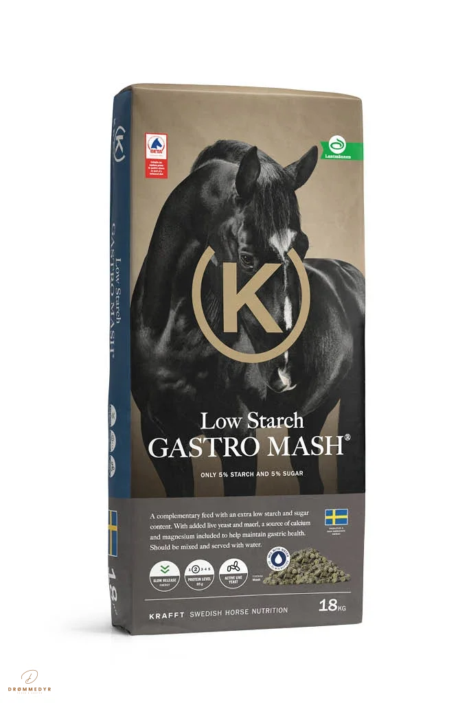 Krafft Gastro Mash er et korn- og melassefrit mashfoder, udviklet til heste med sensitiv mave og fordøjelsesudfordringer. Foderet har et lavt indhold af stivelse og sukker og er i stedet baseret på fibre, olie og råvarer af høj kvalitet, som giver en blid og stabil energi.