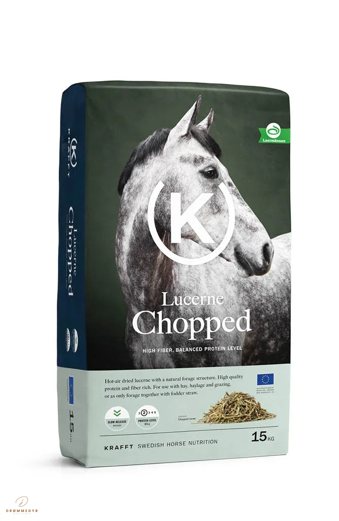 Krafft Lucerne Chopped er et fiberrigt tilskudsfoder bestående af nænsomt hakket lucerne af høj kvalitet. Lucerne er en naturlig kilde til protein, fibre, calcium og andre næringsstoffer, som understøtter muskelopbygning, fordøjelse og trivsel hos heste.