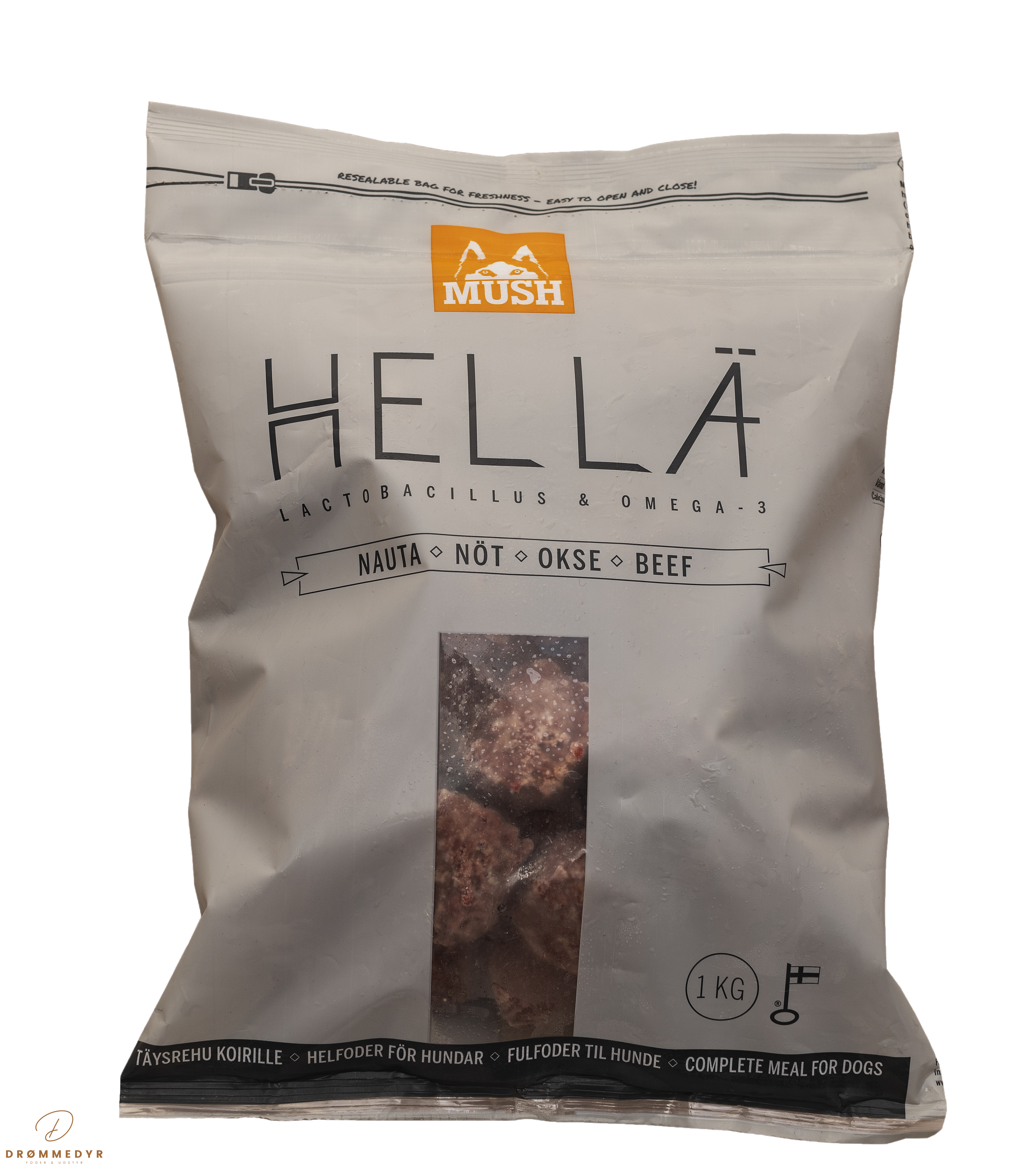 Et naturligt og skånsomt fuldfoder til hunde med særlige behov. MUSH HELLÄ Okse er baseret på frisk finsk oksekød kombineret med grøntsager og sunde olier, som giver hunden et nærende og balanceret måltid.