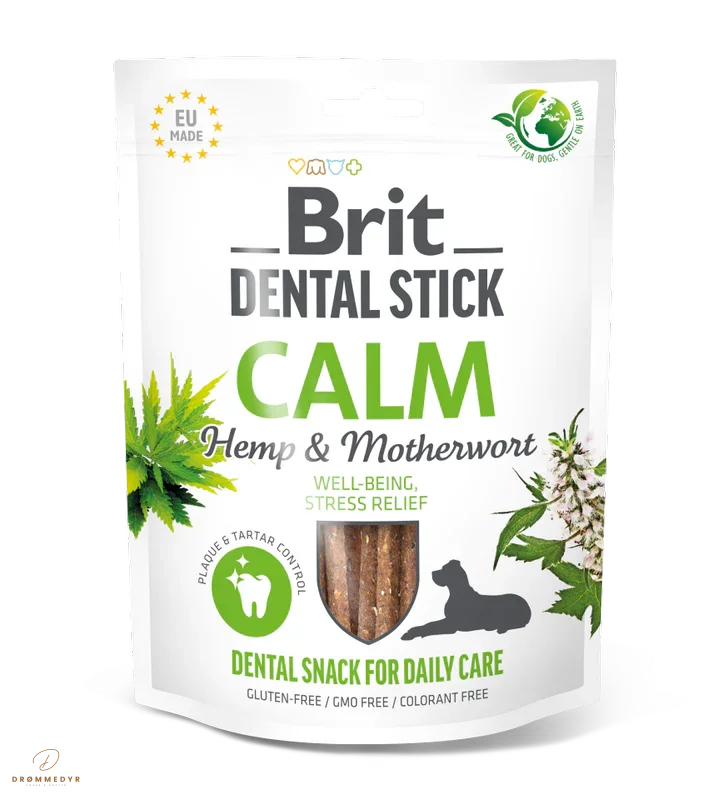 Brit Dental Stick Calm er en tyggepind med naturligt indhold af hamp og hjertensfryd, der støtter velvære og ro. Samtidig hjælper den med at reducere plak og tandsten, så hundens tænder forbliver sunde og ånden frisk.