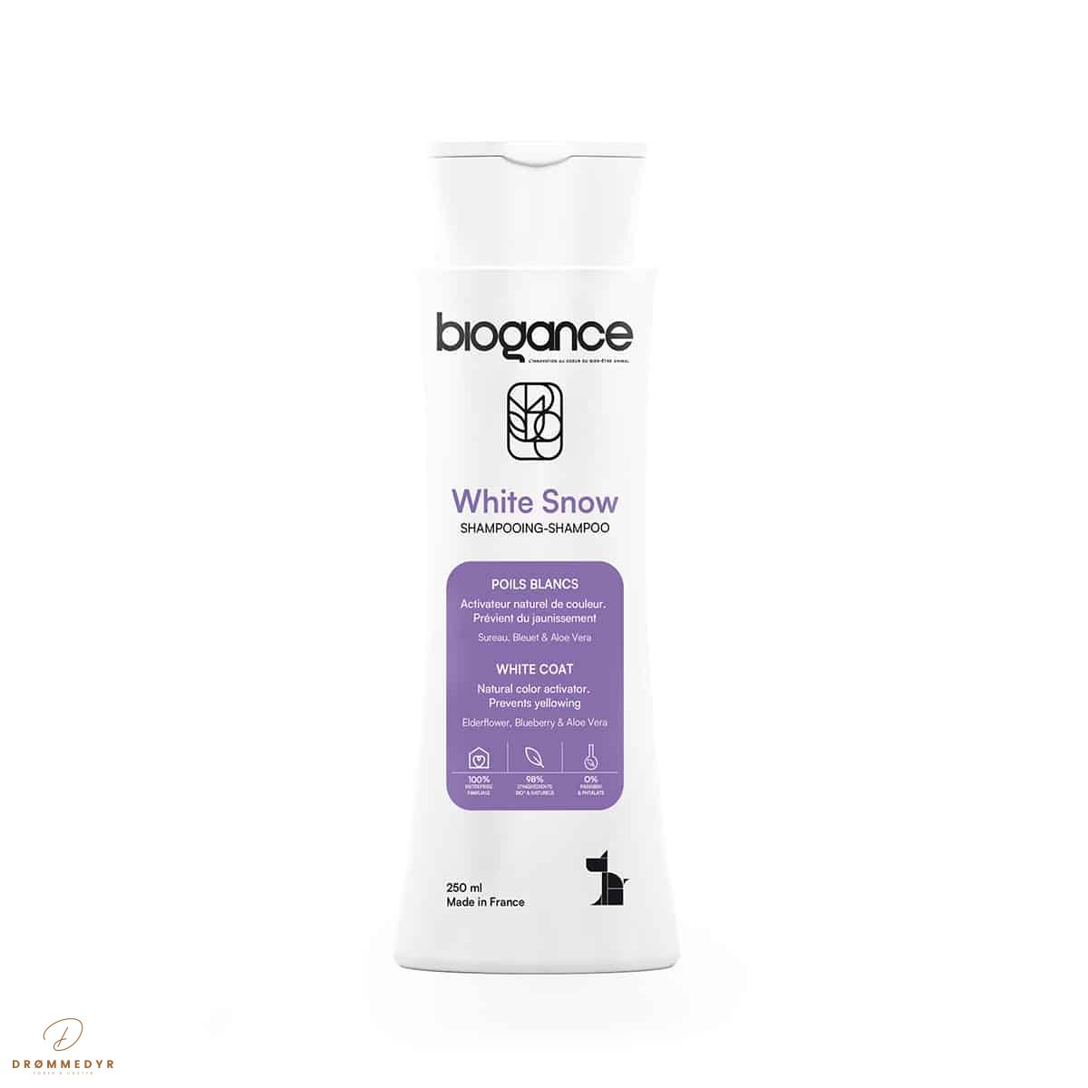 Biogance White Snow Shampoo er en skånsom hundeshampoo specielt udviklet til hvide og lyse pelsfarver. Den naturlige formel er beriget med blåbær- og aloe vera-ekstrakt, som fremhæver pelsens naturlige glans og intensitet uden at bruge blegemidler. Shampooen renser effektivt, tilfører fugt og efterlader pelsen blød, smidig og let at børste ud.