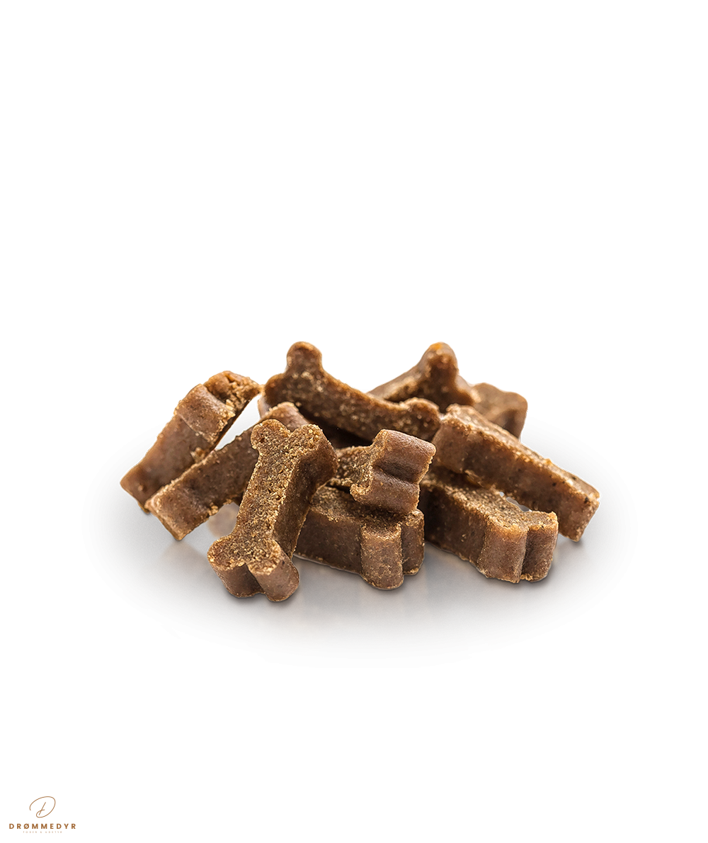 De bløde og velsmagende bidder har den ideelle størrelse til både hvalpe og voksne hunde. Med naturlige ingredienser, uden korn, farvestoffer eller konserveringsmidler, får du en godbid, der både støtter sund hud og blank pels – og som hunde simpelthen ikke kan modstå.