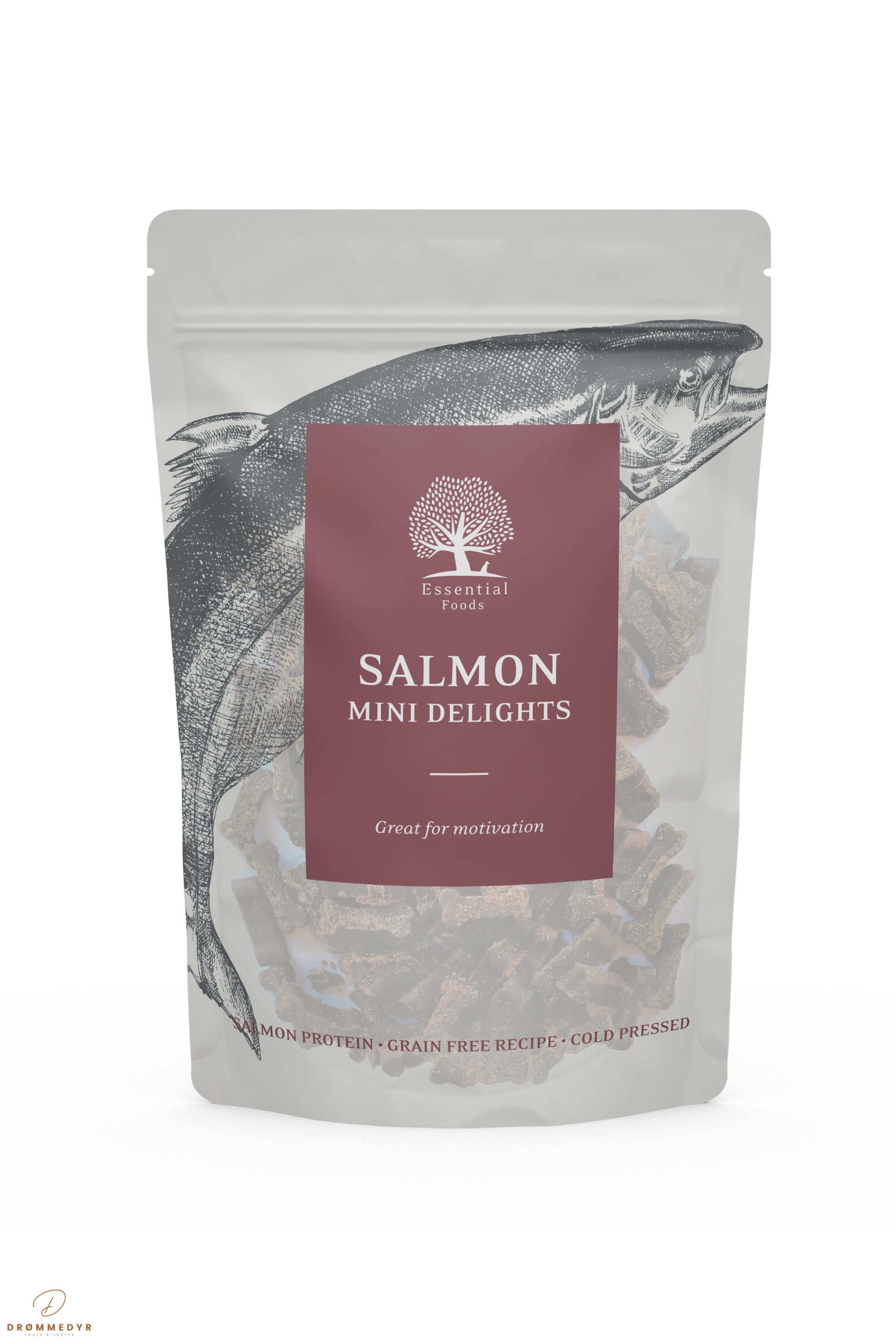 ESSENTIAL Salmon Mini Delights er små, kornfri godbidder lavet af lækker laks – en naturlig og sund snack fyldt med smag, protein og gavnlige omega-3 fedtsyrer. Perfekte til træning, belønning eller bare som lidt ekstra forkælelse i hverdagen.