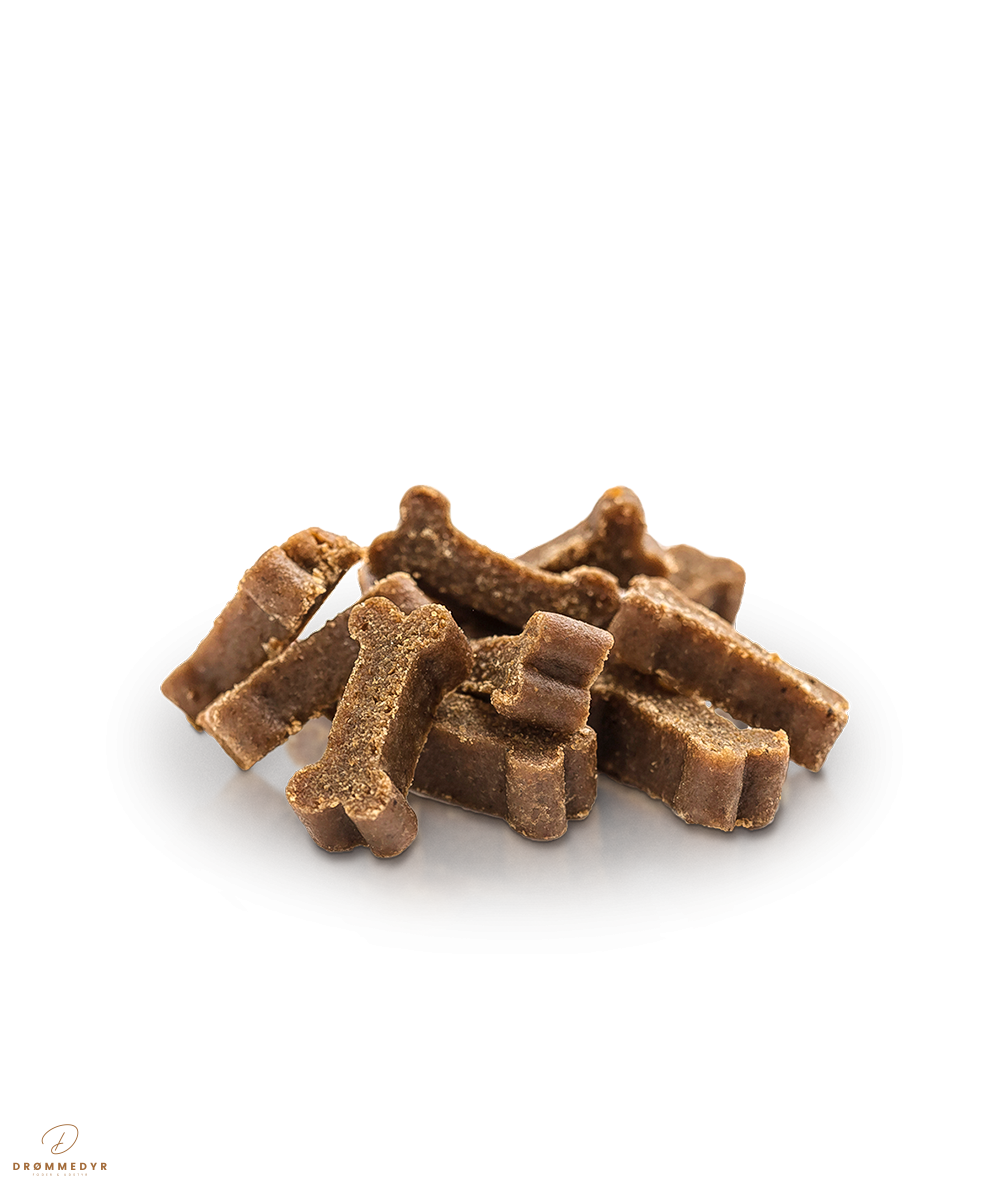 De bløde, aromatiske bidder har den ideelle størrelse til både hvalpe og voksne hunde. Med deres høje kødindhold og naturlige ingredienser uden korn, farvestoffer eller konserveringsmidler, får du en sund godbid, som din hund vil elske hver gang.
