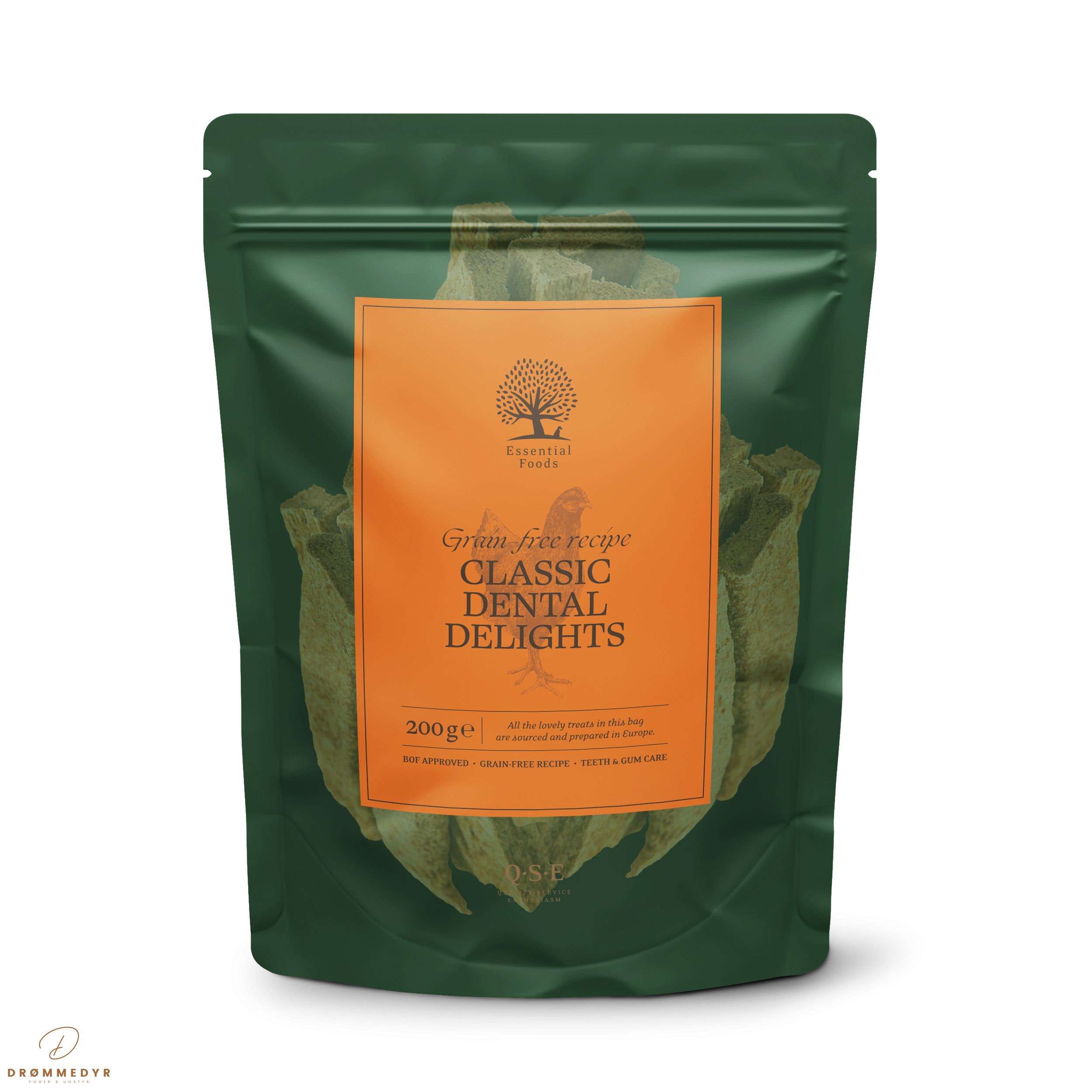 ESSENTIAL Grain-Free Classic Dental Delights er velsmagende, kornfri tyggepinde, der kombinerer naturlig tandpleje med lækker smag. Disse klassiske dental snacks hjælper med at reducere plak og tandsten – og gør tandpleje til en ren fornøjelse for din hund.