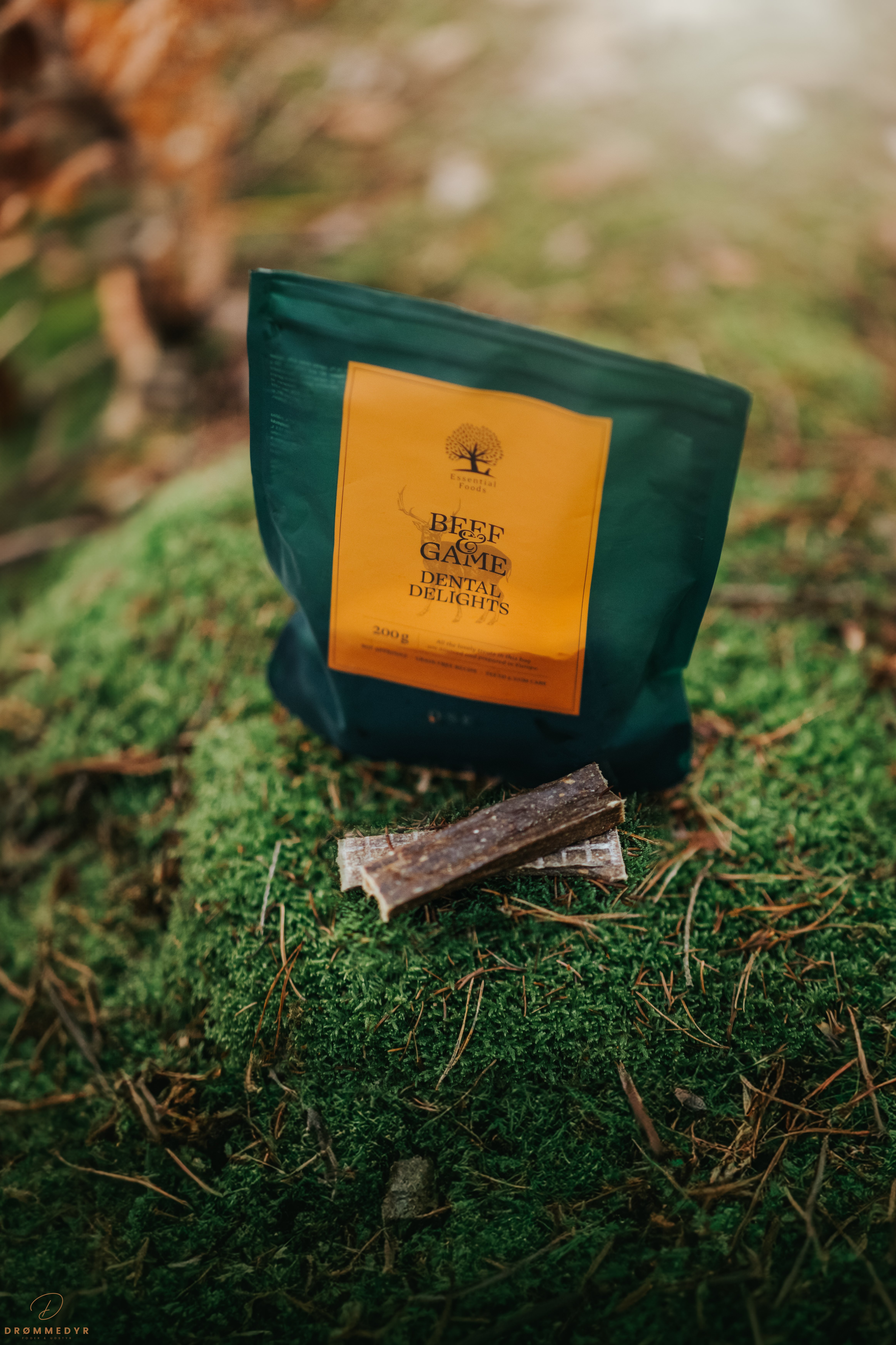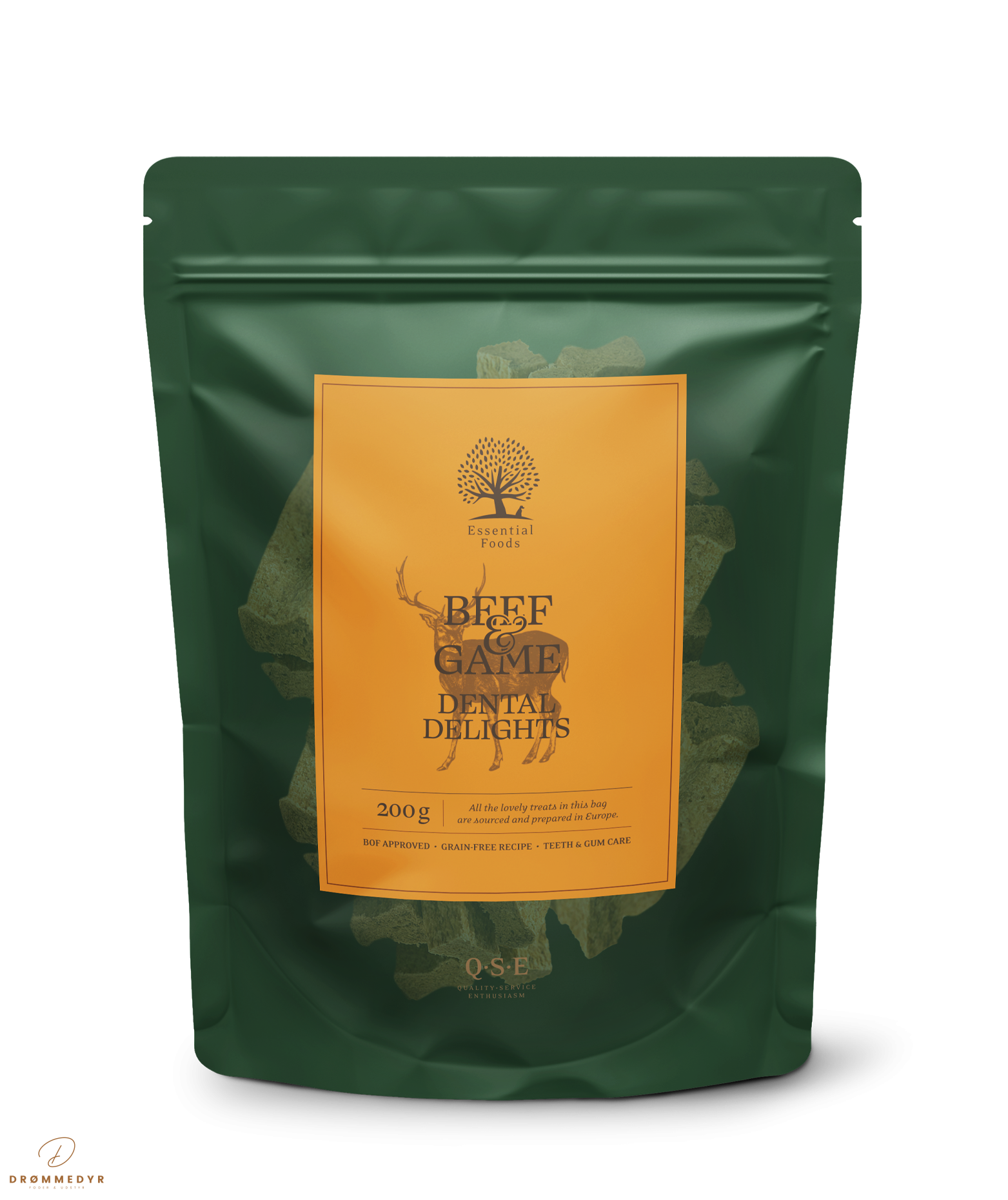 SSENTIAL Grain-Free Beef & Game Dental Delights er kornfri, naturlige tyggepinde, der kombinerer lækker smag med effektiv tandpleje. Lavet af okse- og vildtkød – en uimodståelig kombination, der giver hunden en sund tyggeoplevelse og hjælper med at holde tænderne rene.