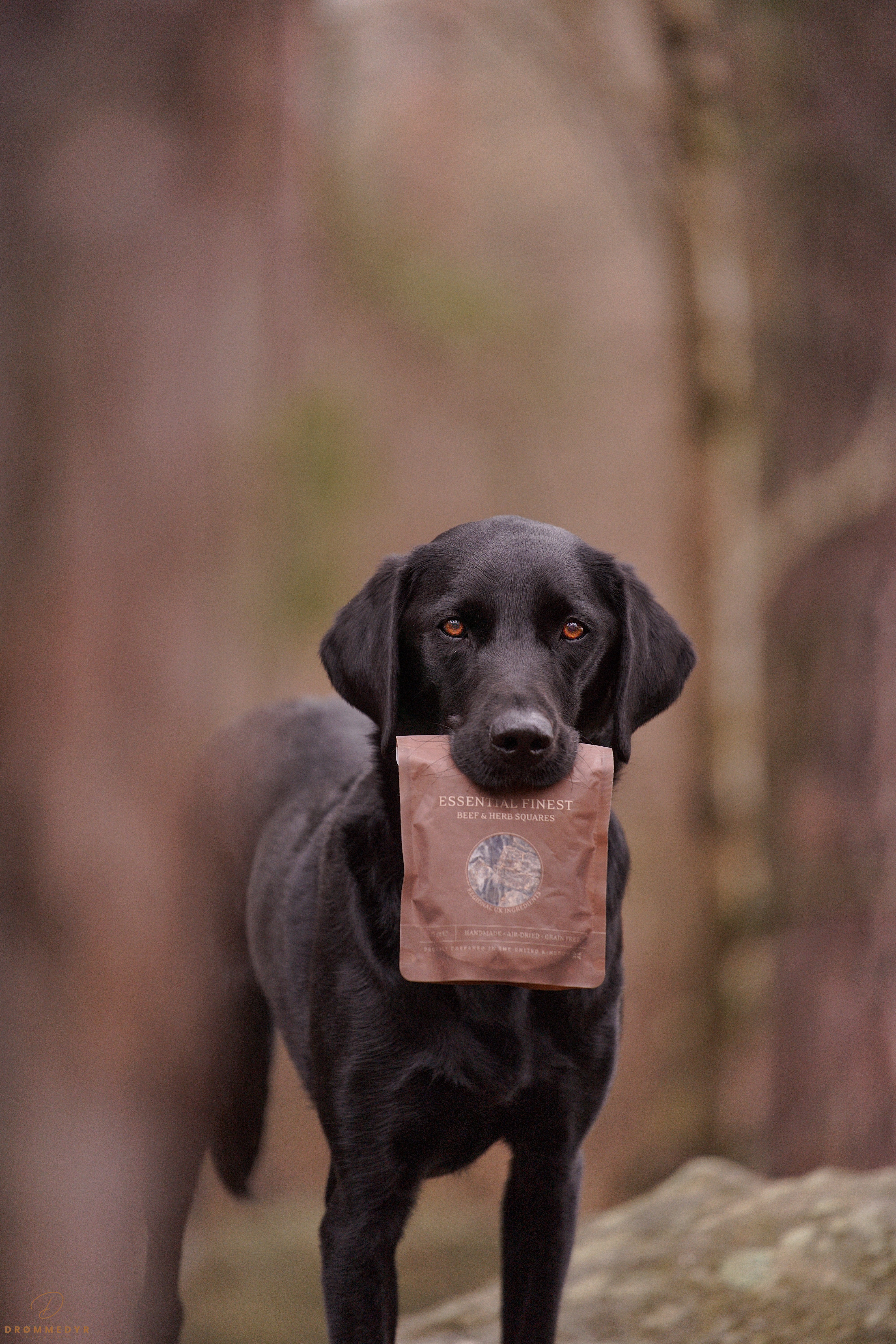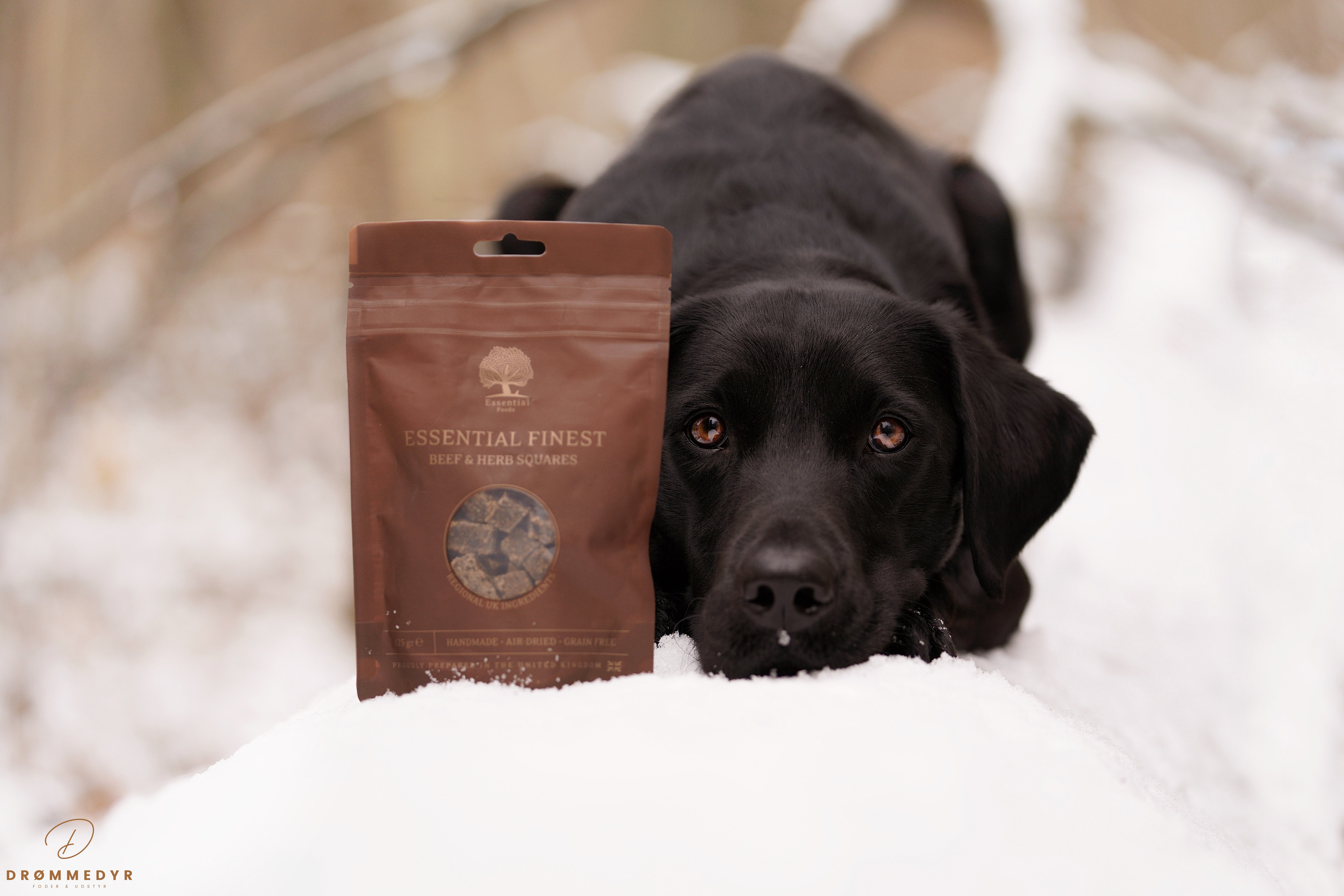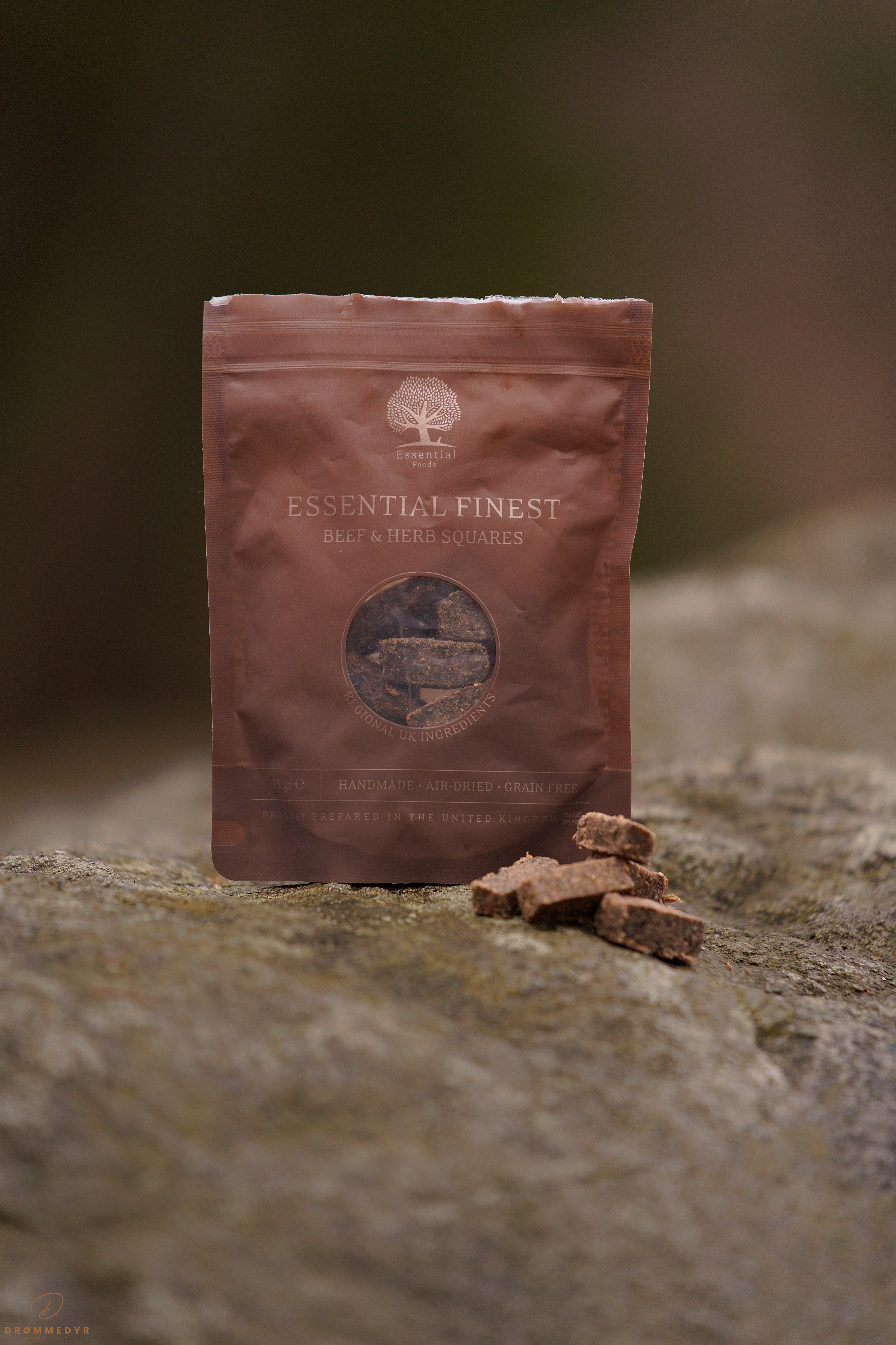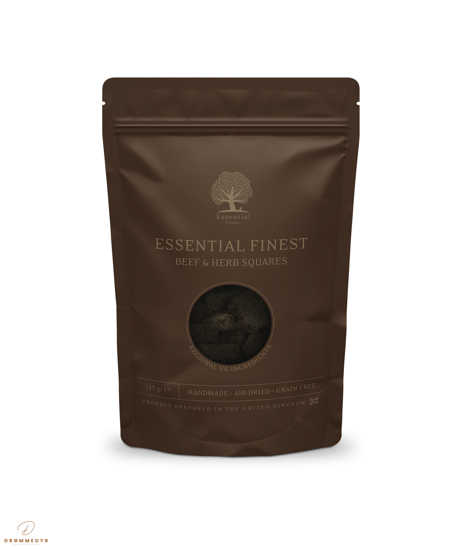 ESSENTIAL Finest Beef & Herb Squares er velsmagende, kornfri godbidder lavet af saftigt oksekød og duftende urter – en naturlig og lækker snack, der vil få enhver hund til at logre af begejstring.
