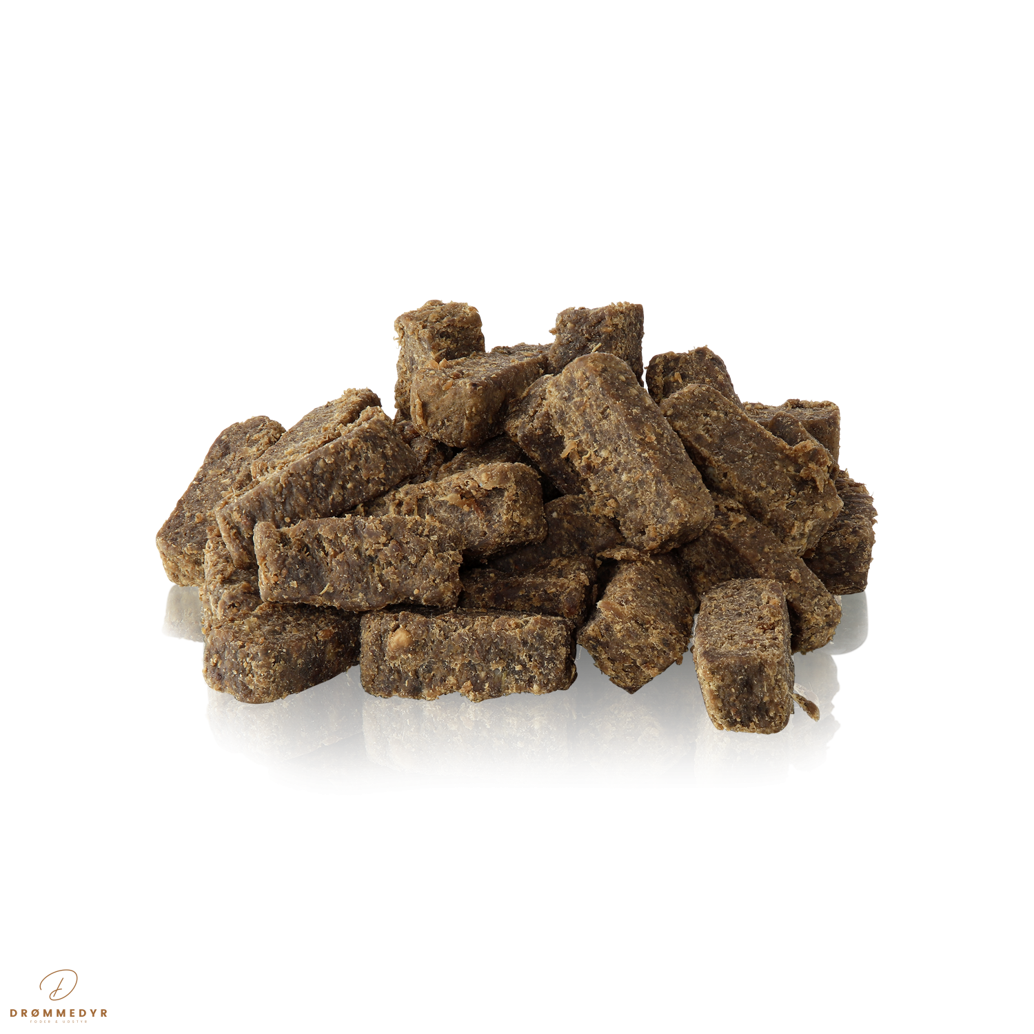 De bløde firkanter er nemme at tygge og perfekte til både træning, belønning eller som en lille luksus i hverdagen. Med deres høje indhold af protein og rene ingredienser får du en godbid, der både smager fantastisk og støtter din hunds trivsel.