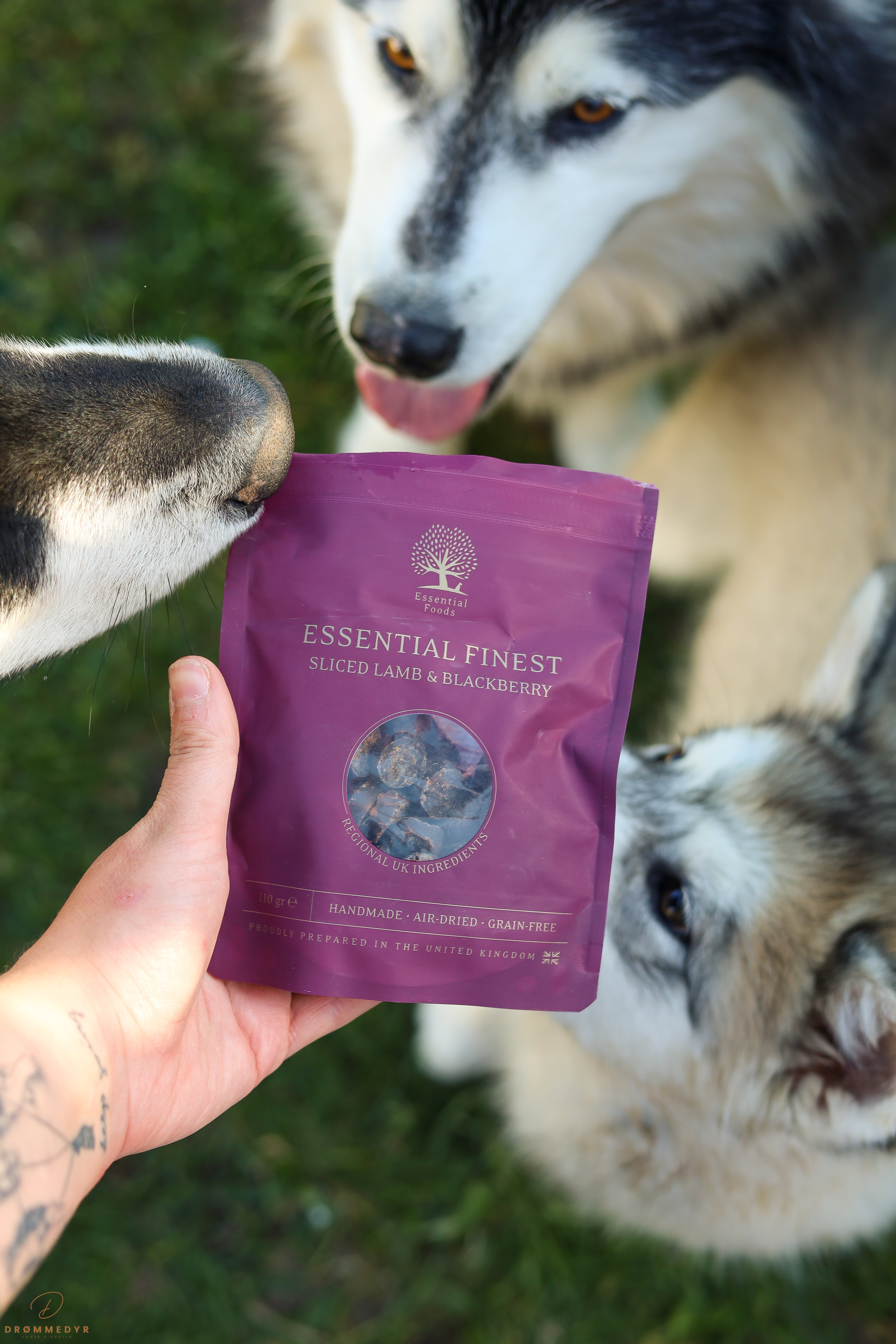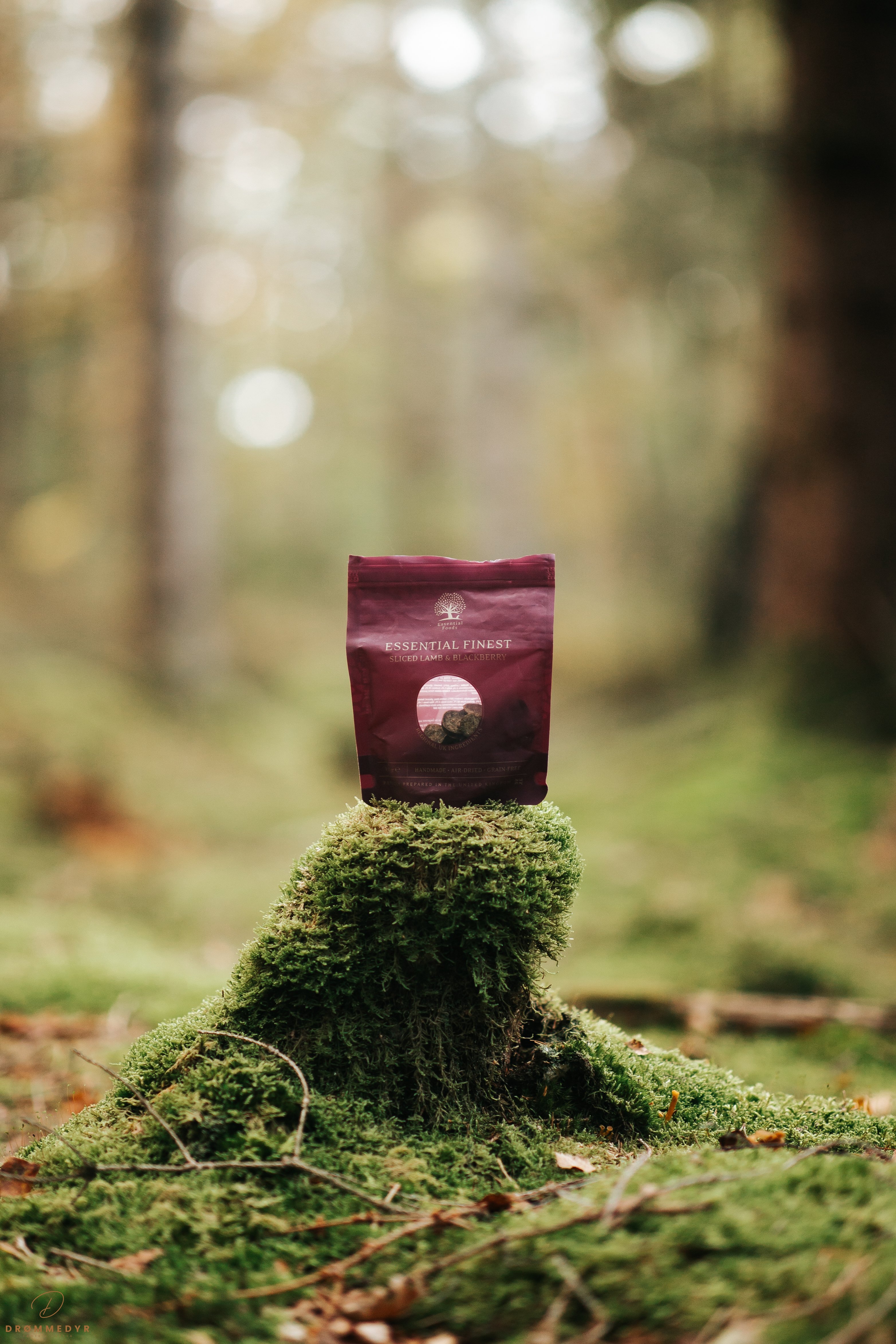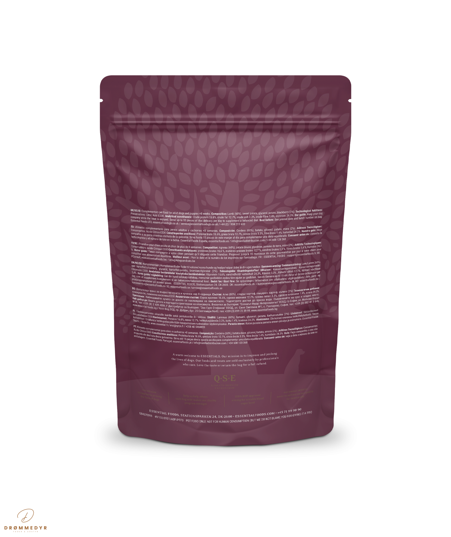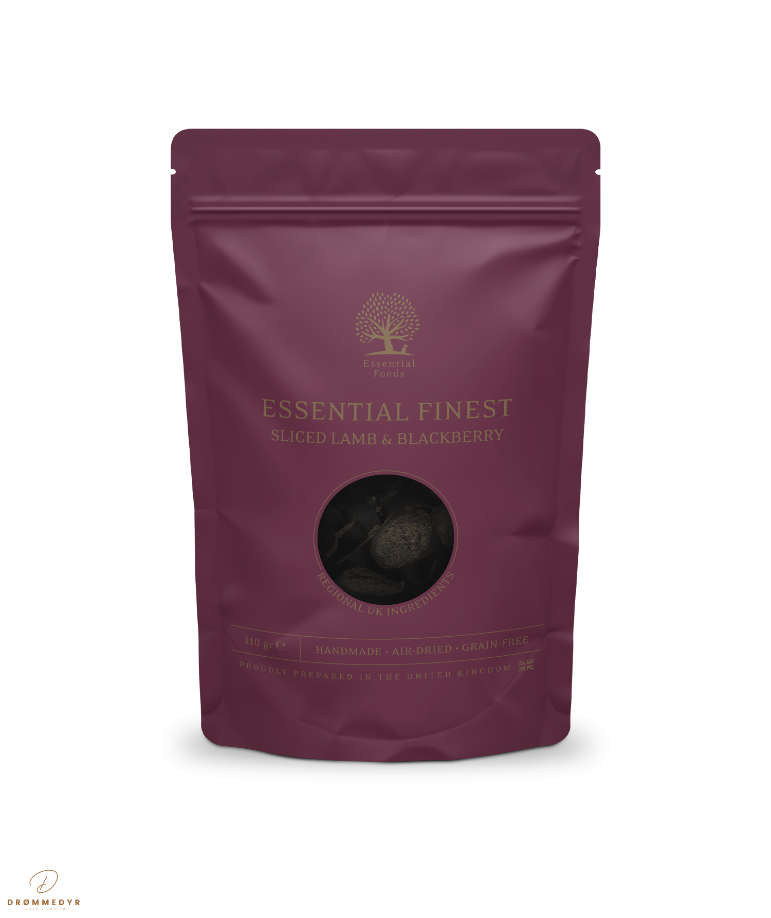 ESSENTIAL Finest Sliced Lamb & Blackberry er en uimodståelig luksusgodbid lavet af nøje udvalgt lam og saftige brombær. En blød og naturlig snack, som både hunde og ejere elsker – perfekt som belønning, træningsgodbid eller en lille forkælelse i hverdagen.