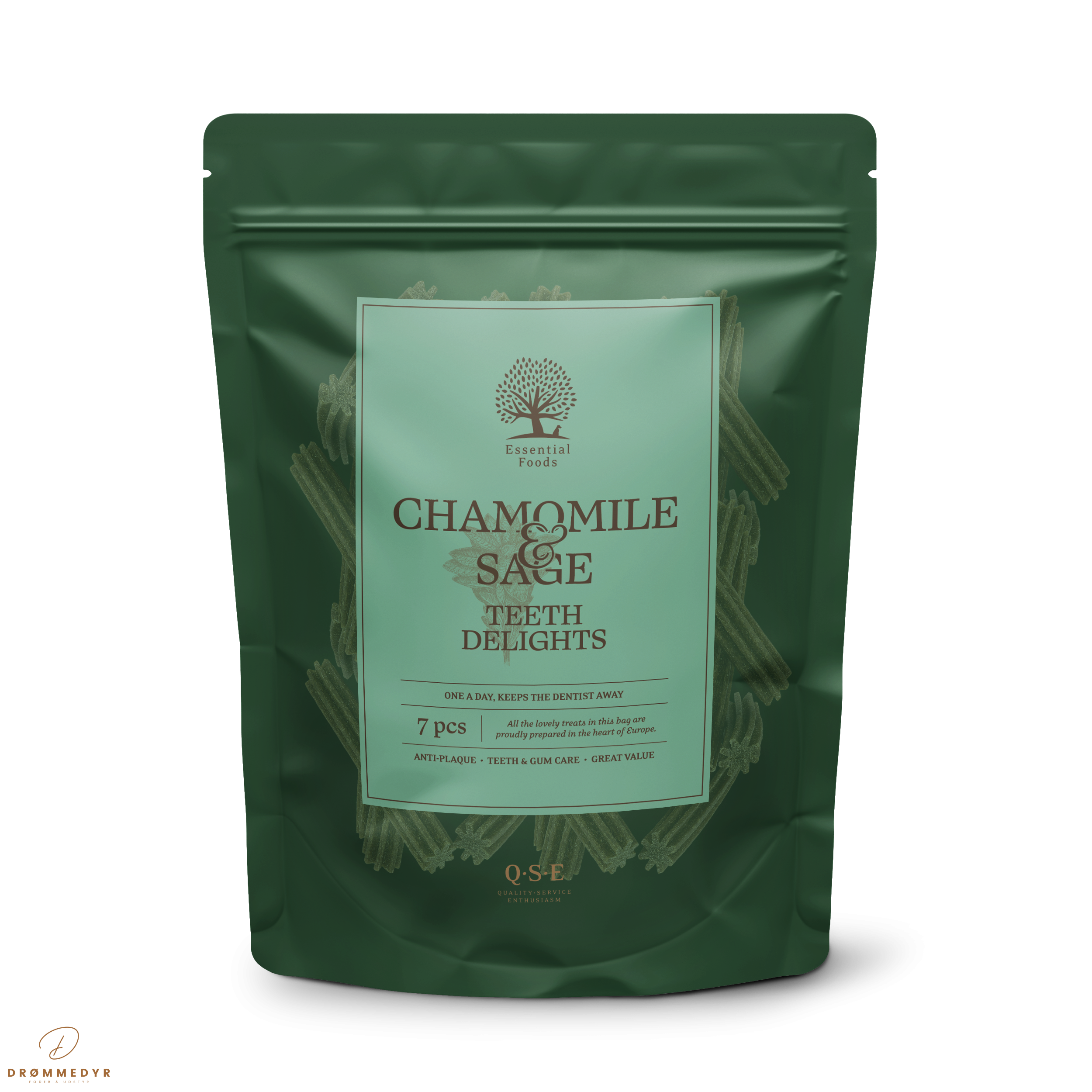 ESSENTIAL Chamomile & Sage Teeth Delights er kornfri tandplejegodbidder, der kombinerer kamille og salvie for at fremme frisk ånde, sund mundhygiejne og en naturligt beroligende effekt. Kamille støtter ro og velvære, mens salvie bidrager med antibakterielle egenskaber, som hjælper med at holde tænder og gummer sunde.