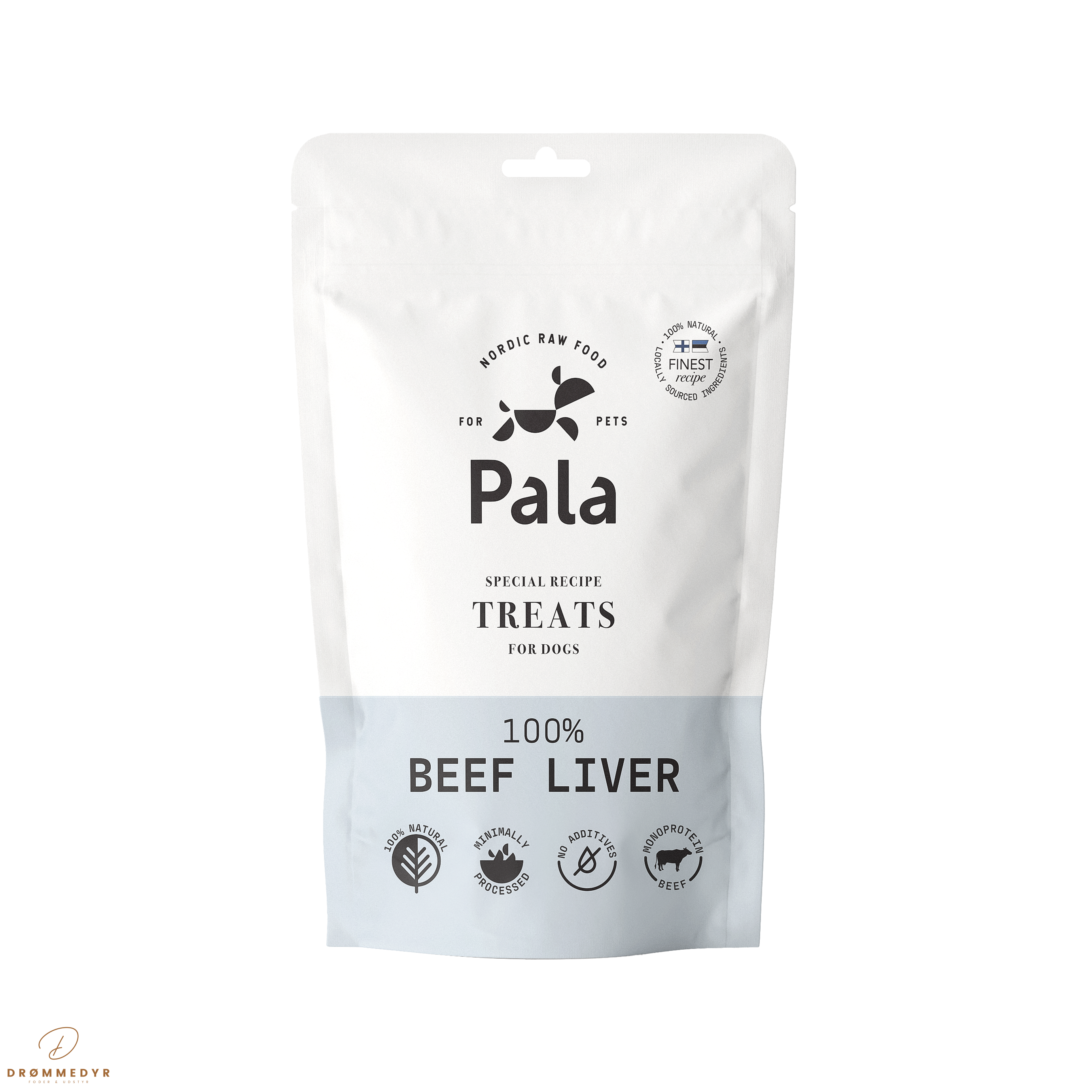 Pala Treats Okselever er en lufttørret, naturlig godbid fremstillet af 100 % okselever. Den skånsomme lufttørring bevarer råvarens naturlige smag og næringsstoffer og giver en intens smag, som gør godbidden særligt attraktiv for hunden.