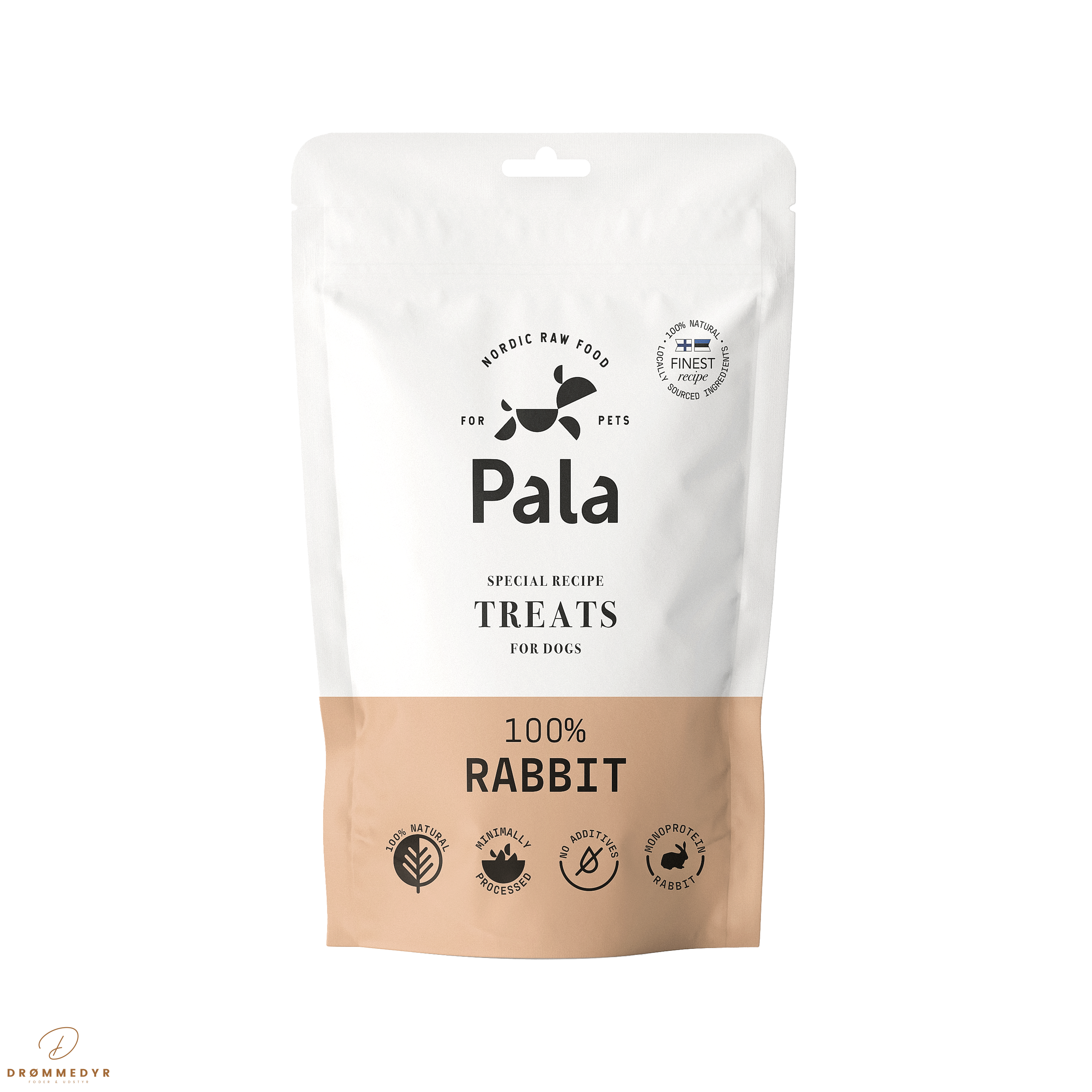 Pala Treats Kanin er en lufttørret, naturlig godbid fremstillet af 100 % kanin. Den skånsomme lufttørring bevarer råvarens naturlige smag og næringsstoffer og giver en let og velsmagende godbid med høj accept hos hunde.