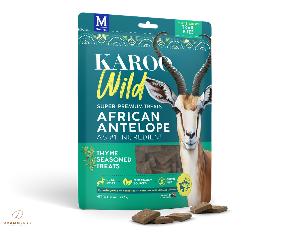 Karoo Wild hundegodbidder er lavet af antilopekød fra Afrika. En godbid som har et lavt fedtindhold og et højt proteinindhold samt en karakteristisk vildtsmag, som er uimodståelig for hunde.