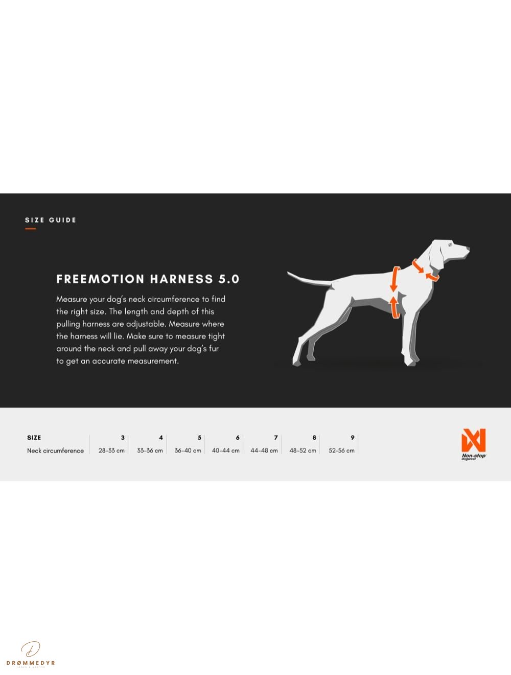 Freemotion 5,0 hundesele af mærket Non-Stop. Justerbar træksele med et ergonomisk design, udviklet, testet og brugt af verdensledende atleter indenfor canicross, bikejoring og skijoring, men kan anvendes til enhver aktiv hund. En god sele er afgørende for hundens komfort, ydeevne og forebyggelse af skader. Folkene bag Non-Stop begyndte at sy den første prototype af Freemotion-selen i 2006. Produktudviklingen har været kontinuerlig lige siden. Denne opgraderede version af Freemotion-selen er derfor resultatet af mange års erfaring og test.