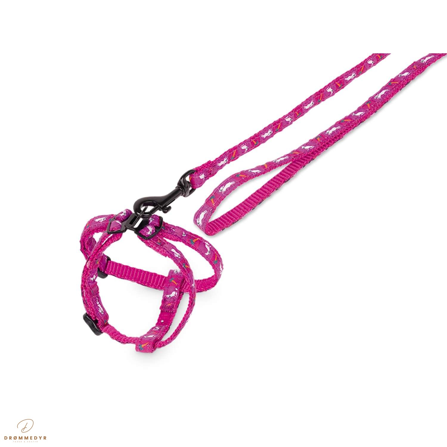 Lilla gulerodssæt med line og sele til kaniner. Lavet af nylon og let at håndtere. Linen er 1 meter lang og selen er 10 mm bred. Perfekt til besøg hos dyrlægen eller rejser. Farve: lilla.